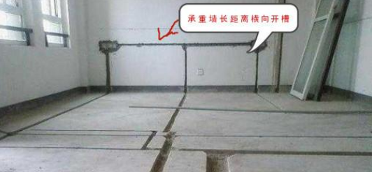 横向在承重墙上开槽会碰到很多承重钢筋,而为了深度适中,必须切掉钢筋才能将管埋到墙体里面,这是不可取的,这样施工违反《建筑装饰安全施工标准》的违规行为,严重影响整栋楼的承重能力,增加危险系数,是坚决杜绝的不良行为。